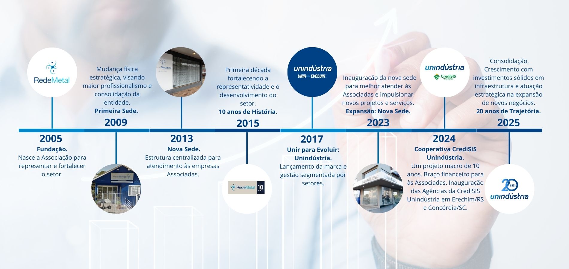 Uma história marcada por passos estratégicos e um compromisso com o desenvolvimento coletivo. Em nossa "Linha do Tempo", compartilhamos os marcos que transformaram a antiga Rede Metal na força que a Unindústria representa hoje para o setor.